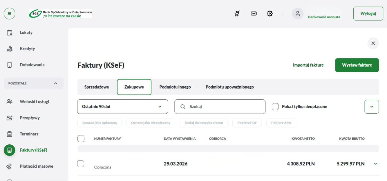 E-Faktura to nowa funkcjonalność umożliwiająca klientom w bankowości internetowej SGB24/SGB24 Biznes pełną obsługę faktur elektronicznych w zakresie: